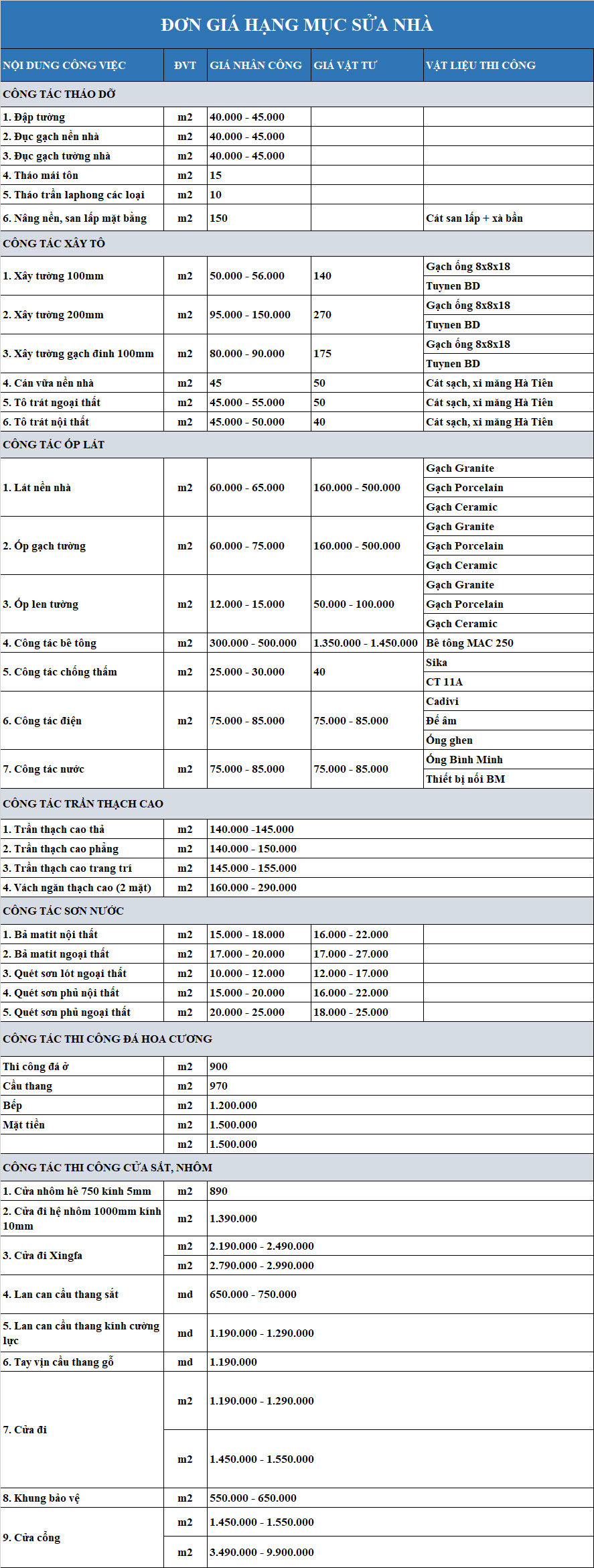 Bảng giá sửa chữa nhà trọn gói